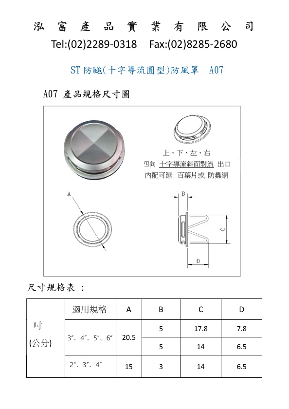 | 規格: | 3英吋、4英吋、5英吋、6英吋、8英吋 皆可通用 (尺寸通用 W 彈簧式)。 4向 {上·下·左·右- 強 風壓排出} (罩體側邊可依客製化開孔排風向) 3向、2向 (罩體側邊可依客製化開風向口)。 **外罩內配件-可依客製更改為(流暢排風-防蟲網)。 (大)外罩直徑:20.5cm , 外罩高度:5cm (小)外罩直徑:15cm , 外罩高度:3cm 使用不銹鋼304材質 防水 防風 抗氧化 專利證號: M404947 |