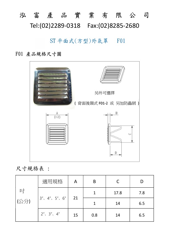 | 規格: | 2英吋、3英吋、4英吋、5英吋、6英吋通用 (F01-尺寸通用W彈簧式、F01-2 套管式)。 可另加 #(防蟲網)# 外罩直徑:(大)21cmx21cm 及 (小)15cmx15cm 使用不銹鋼304材質 防水 防風 抗氧化 |